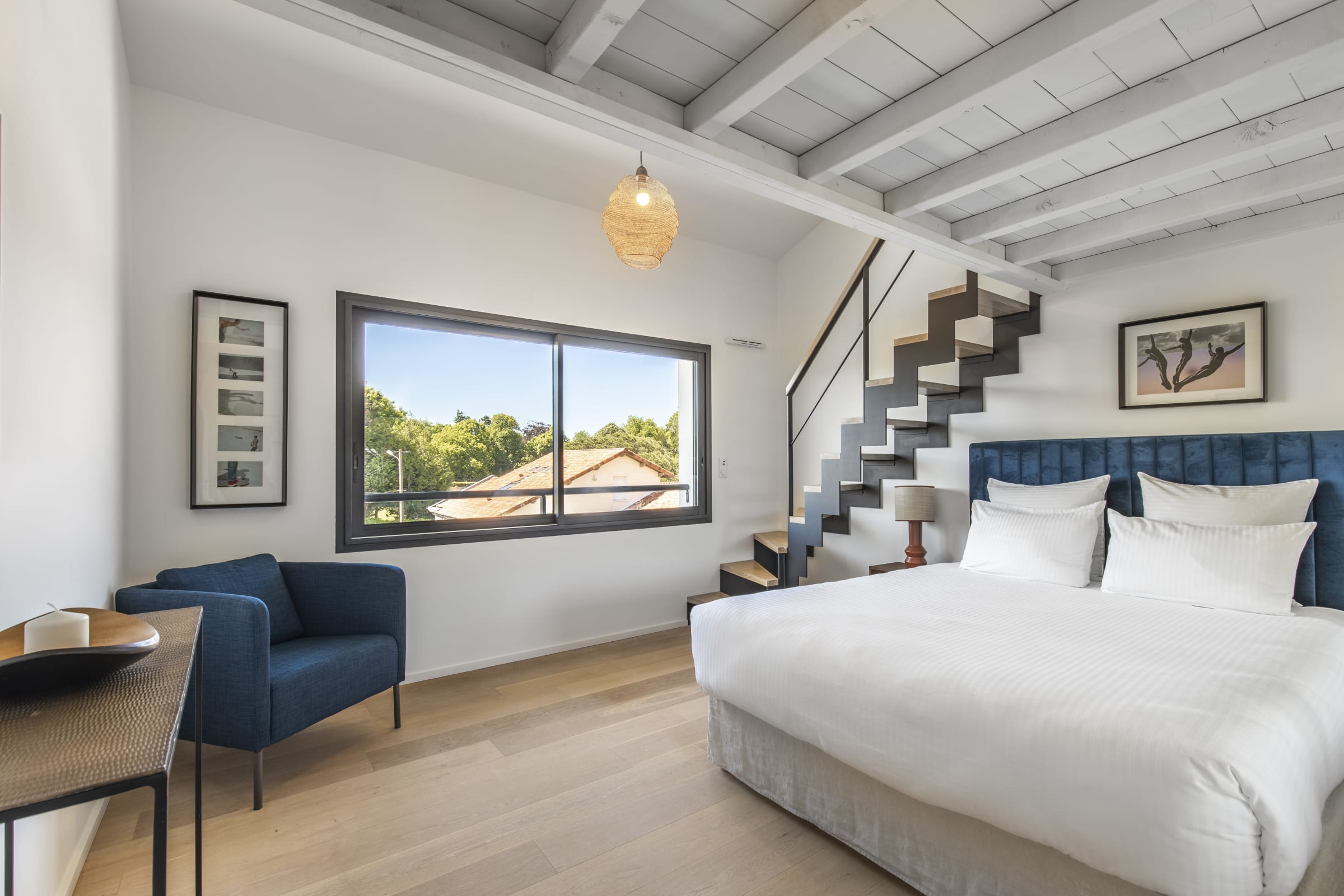 -A parental suite with a double Queen size bed, a double shower, towel dryer, double bassin. One toilet. And a dressing. This bedroom gives onto an outdoor terrace.