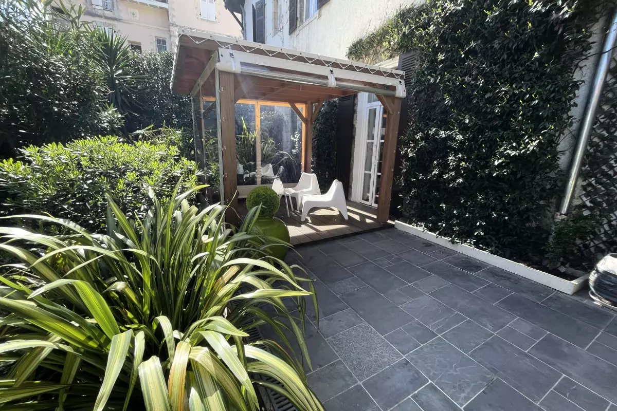 Tastefully and elegantly decorated, the apartment offers a cozy atmosphere, ideal for a stay in the heart of the Basque Country. The glass doors of the living room and kitchen open onto an unexpected outdoor space in the city: a large landscaped garden with a paved terrace, table, chairs and garden furniture – a true haven of greenery right in the center!
